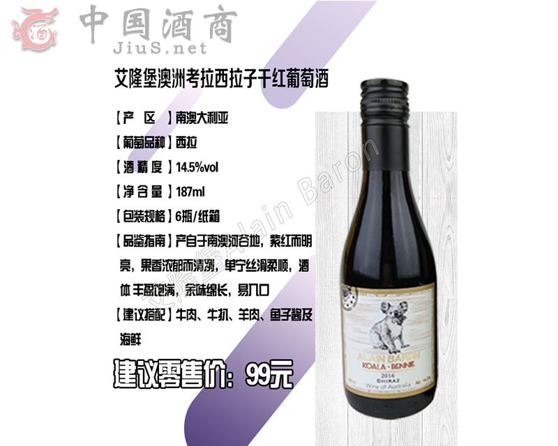 | 產(chǎn)品名稱 | 艾隆堡®澳洲考拉西拉子干紅葡萄酒 | 產(chǎn)品類別 | 紅酒招商 |