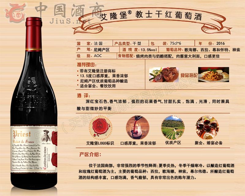 | 產(chǎn)品名稱 | 艾隆堡®教士干紅葡萄酒 | 產(chǎn)品類別 | 葡萄酒招商 |